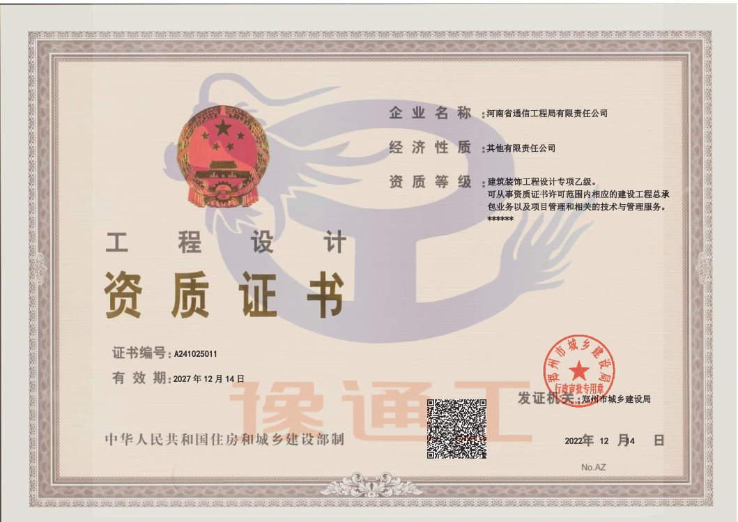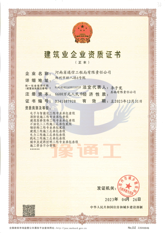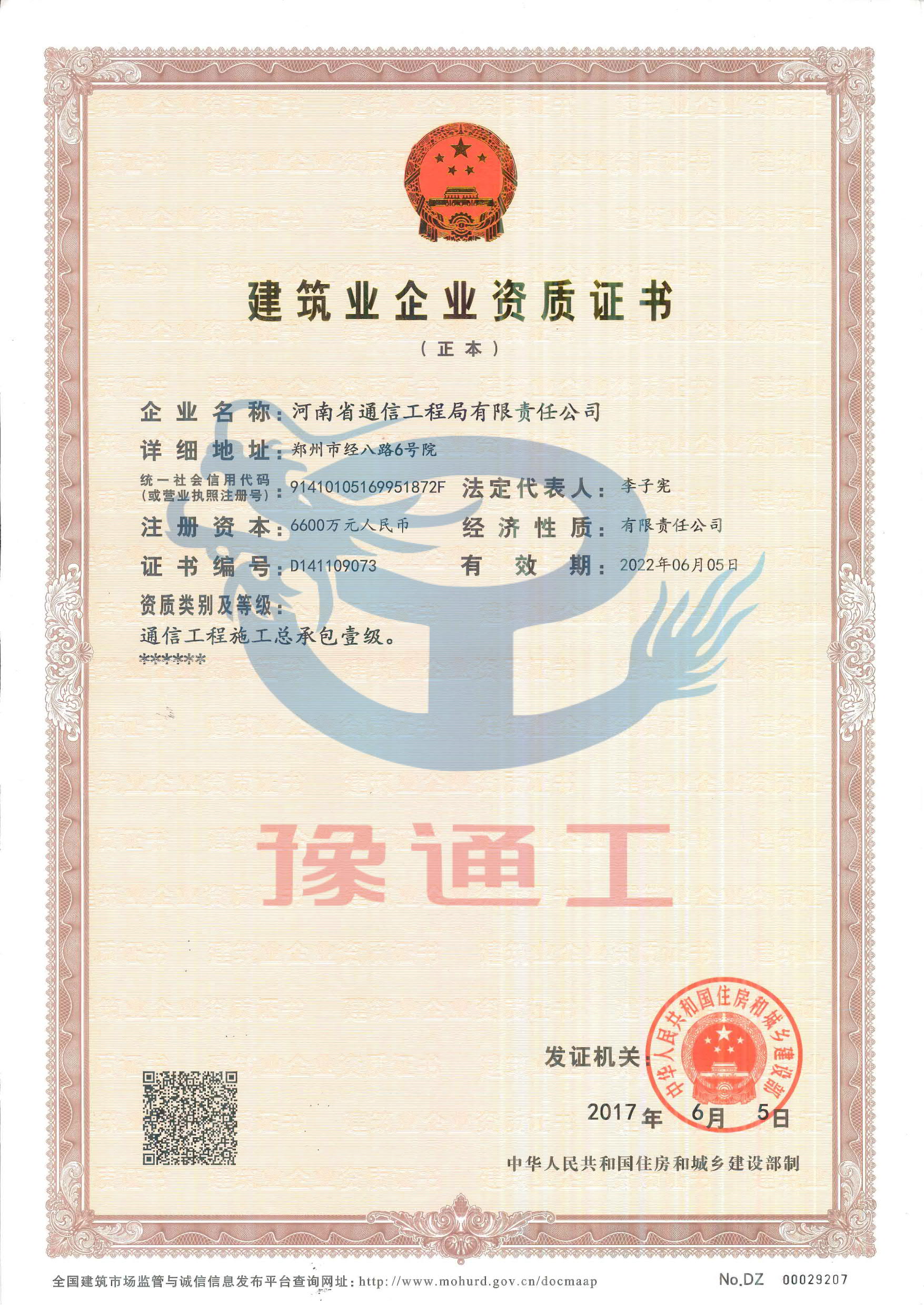 電子與智能化、建筑裝修裝飾、消防設施工程專業(yè)承包壹級;鋼結(jié)構(gòu)工程專業(yè)承包貳級;建筑工程、電力工程、機電工程、城市及道路照明工程專業(yè)施工總承包叁級;施工勞務不分等級。